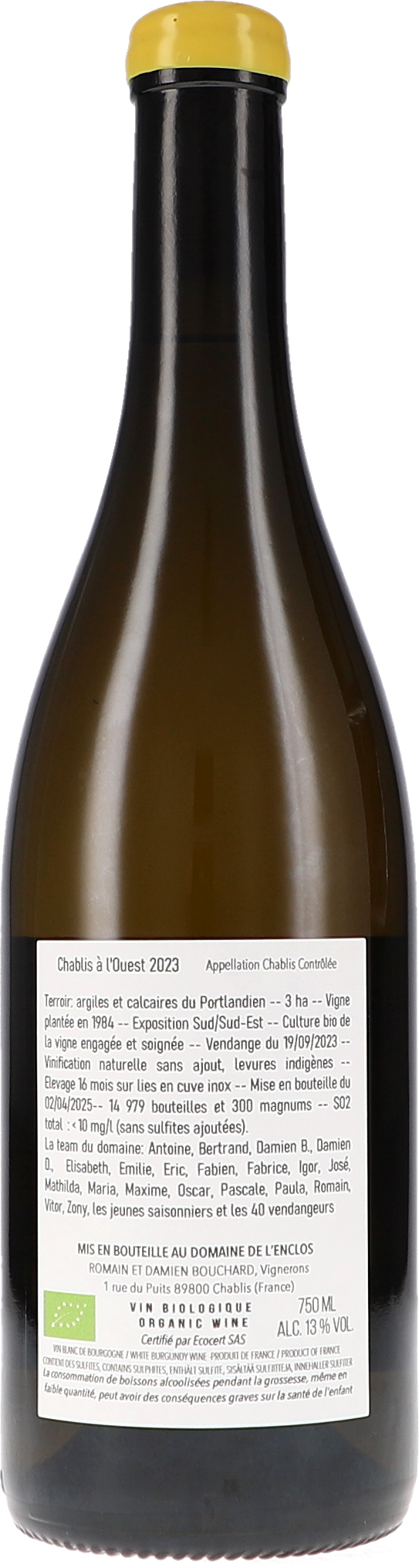 In der Nase zeigt sich der 2023 Chablis à l 'ouest mit saftigen Aromen von reifen gelben Früchten, exotische Noten von Mango, Limette und Papaya. Durch das lange Hefelager treten Noten von hellem Tabak und ein Hauch weiße Schokolade hinzu. Seine Mineralität ist markant, präsent und fasst alles wunderschön ein.