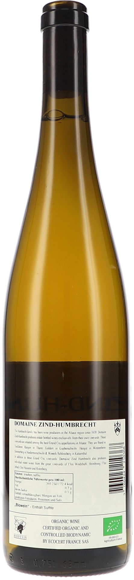 Die Domaine Zind-Humbrecht ist unter diesem Namen im Jahr 1959 anlässlich der Hochzeit von Léonard Humbrecht mit Geneviève Zind und aus der Vereinigung der beiden Weingüter Humbrecht in Gueberschwihr und Zind in Wintzenheim entstanden. Die Familie Humbrecht hat bereits zur Zeit des Dreißigjährigen Krieges (1618-1648) Wein erzeugt. Die Domaine Zind-Humbrecht, die Anfang der 1960er Jahre noch weniger als fünf Hektar umfasste, wuchs bis Mitte der 1990er Jahre auf vierzig Hektar an. Dazu gehören Parzellen in Grand-Cru-Lagen wie Rangen (Thann) oder Brand (Turckheim). 1989 übernahm Olivier das Weingut. Der erste Master of Wine in der Familie hat das Weingut 1999 auf biodynamische Bewirtschaftung umgestellt und ist außerdem Vorsitzender von Biodyvin. Die Weine werden heute allesamt in großen Fässern mit langem Hefelager erzeugt. Botrytis kommt in den trockenen Weinen nicht vor.