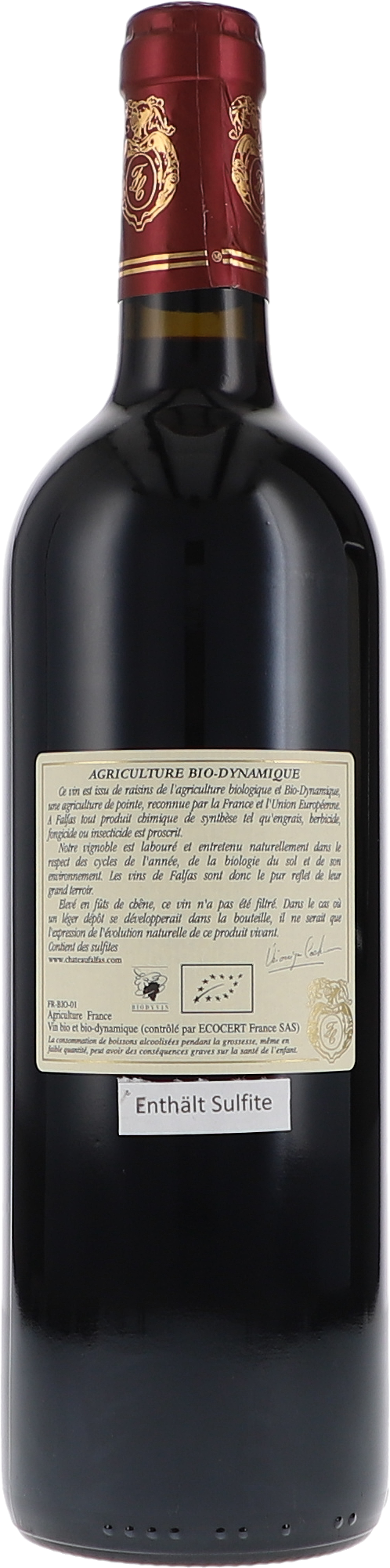 Seit 1988 ist das Château im Besitz der Familie Cochran. Die Weine zählen zur Avantgarde der Region Côtes de Bourg und werden dank ihrer außergewöhnlichen Kraft und Finesse regelmäßig von der internationalen Fachpresse ausgezeichnet. In der Tradition der großen Weingüter dieser Welt gehören geringe Erträge und eine strenge Selektion des Traubenmaterials zum Standard von Château Falfas. Die gesunden und gehaltvollen Trauben sind die Grundlage für Weine, die die vielschichtigen und komplexen Böden des Terroirs widerspiegeln. Die Trauben werden per Hand zu ihrem optimalen Reifezeitpunkt gelesen. Eine langsame und sorgsame Vinifikation unterstreicht die hohe Qualitätsphilosophie von Château Falfas. Korbpressen, kalte Mazeration, eine kühle Fermentation sowie der Ausbau in französi-scher Eiche gehören hier zum Handwerk. Das Ergebnis sind Weine, die exzellent in der Flasche reifen und über ein entsprechendes Alterungspotenzial verfügen.