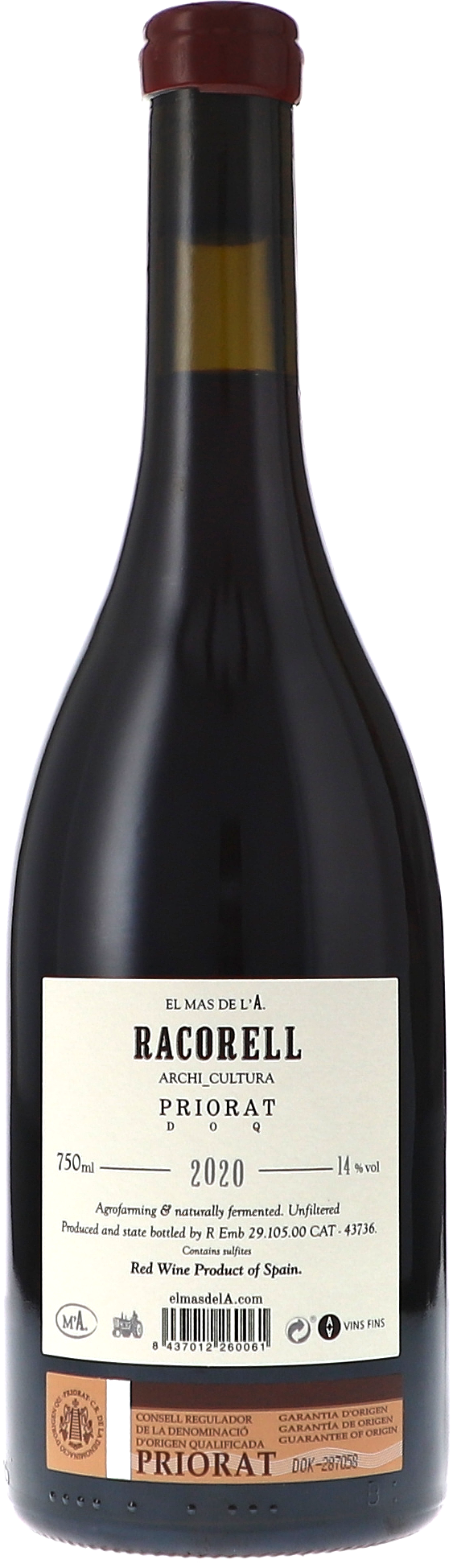 El Mas de l'A ist das neueste Projekt von Alfredo Arribas im DOQ Priorat. Sein Rotwein Racorell 2020 ist ein Blend aus der weit verbreiteten Rotweintraube Garnacha Tinta sowie deren selten vorkommenden Mutationen Garnacha Peluda und Garnacha Gris (Graue Grenache). Die Spontanvergärung des Weins erfolgte in Betontanks. Anschließend reifte der Wein für 12 Monate in Fudern und Halbstückfässern.