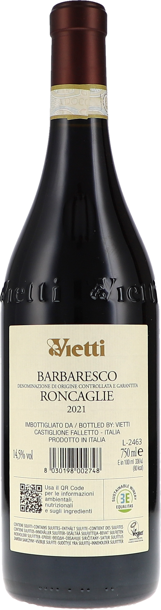 Der 2021er Barbaresco Roncaglie ist ein delikater, eleganter und duftiger Nebbiolo, der sich mit Noten von Rosenblüten und Minze, Unterholz, Holz und Erde, etwas Cola und roter Frucht präsentiert.