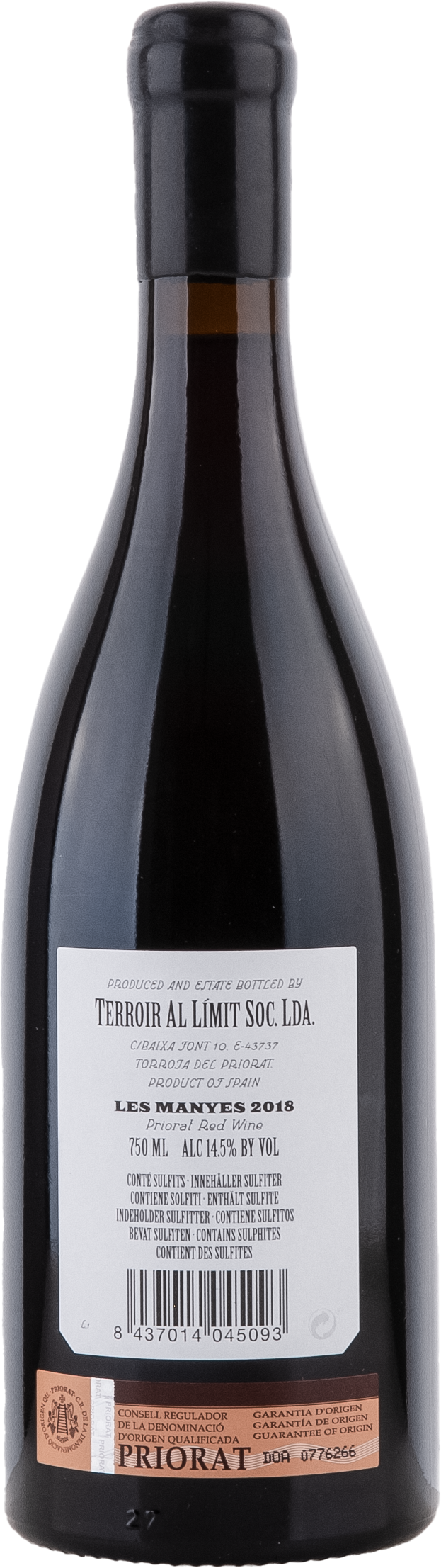 Auf dem Etikett steht über Les Manyes „Vi d´altura“. Das bedeutet aus dem katalanischen übersetzt. Wein aus der Höhe. Dieser reinsortige Grenache kommt aus einer 1,5ha großen Parzelle am nördlichen Ende des Priorat am Fuße des Montsant-Berges auf ca. 800 Höhenmetern. Dort stehen die 70,75--jährigen Reben auf einem Plateau aus Argile (Lehm & Ton) und wirken zunächst völlig unspektakulär. Um genau zu sein, ist es eine Mutation namens Garnacha Peluda, die einen leichten Flaum auf den Beeren aufweist. Seit dem Jahrgang 2016 ist Dominik Huber für den Les Manyes völlig weg gekommen vom Holz. Zu 100% wird dieser Wein im Zementtank ausgebaut. Er selbst sagt, dass dies der beste Wein ist, der von Terroir al Limit bis dato gemacht wurde.