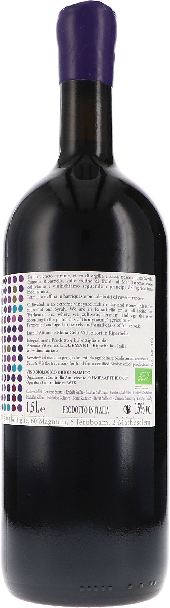 Der Syrah stammt aus dem tonreichen und steinigen Weinberg mit Kalk im Untergrund in Riparbella. Der Weinberg wird von Elena Celli und Luca d´Attoma als extrem bezeichnet. Er orientiert sich zum Tyrrhenischen Meer. Die Reben wurden vor 17 Jahren angelegt. Manuelle Lese und erste Selektion im Weinberg. Sanftes Entrappen und zweite Selektion auf dem Sortiertisch folgen im Weingut. Die Beeren sollen möglichst ohne Verletzungen zur Vergärung im Fass gelangen. Vergoren wird dann in konischen Eichenfässern mit 1000l-Fassungsvermörgen sowie kleinen Barriques französischer Herkunft. Rund 30% der Ernte werden mit ganzen Trauben vergoren. In den Barriques erfolgt manuelle Pigeage während der Gärung. In den konischen Fässern wird der Most über den aufsteigenden Tresterkuchen gepumpt. Nach der Gärung folgt eine Maischestandzeit von 30 Tagen. Nach dem Abstich werden die Weine vermählt und nun zur Reife in die gleichen Fässer zurückgelegt. 80% Erst- und 20% Zweitbelegung der Fässer. Die Reife im Fass dauert 22 Monate an. Bis zur Füllung erfolgt kein weiterer Abstich oder Filtration.