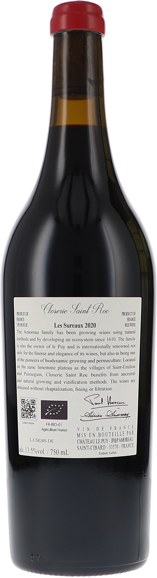 Der Wein stammt von dem 2,2 Hektar umfassenden Weinberg Les Sureaux. Der Weinberg ist geprägt von Ton (30 %), Schluff (40 %) und Sand (30 %) in einer Tiefe von 50 bis 80 cm auf einem Grundgestein von Asteria-Kalk. Er liegt auf einer Höhe von 82 bis 100 Metern. Genutzt wurde für diesen Wein ausschließlich Merlot. Der Weinberg wird biodynamisch bewirtschaftet. Auch sind Agroforstwirtschaft und Permakultur integriert. Nach der Handlese erfolgte eine spontane Gärung, danach die Reifung in gebrauchten Eichenfässern über 18 Monate hinweg. Der Wein wurde ohne Filtration und Schönung gefüllt.
