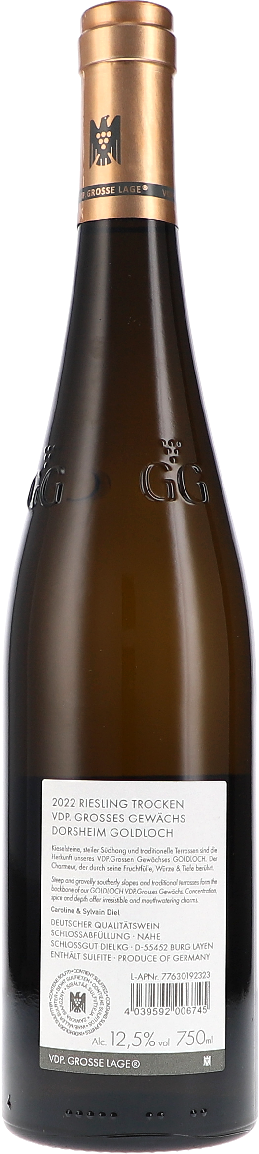 Auf der Zunge betört das Große Gewächs des 2022er Riesling Goldloch vom Schlossgut Diel mit Zug und Saftigkeit zugleich, die belebende Säure und die Aromen von Granny Smith, Aprikose und Zitrus werden von einer salzigen und mineralischen Spur begleitet. Ein wunderbar anregender Riesling, der ein sehr gutes Entwicklungspotential aufweist und Gerichte mit frischen Sidekicks liebt.