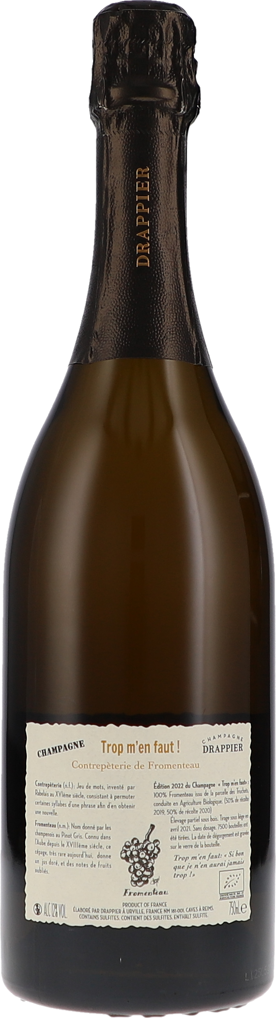 Am Gaumen ist der Trop m'en faut! würzig, saftig und ebenso eigenwillig wie in der Nase. Diese Eigenwilligkeit ist es, die den Champagner zu etwas Besonderem macht. Er ist präzise und klar definiert, bringt mürbe und frische Kernobstnoten mit etwas Ananas, erdigen und kräuterwürzigen Noten, präsentiert sich frisch und lebendig, weich in der Textur, aber druckvoll in der Säure.