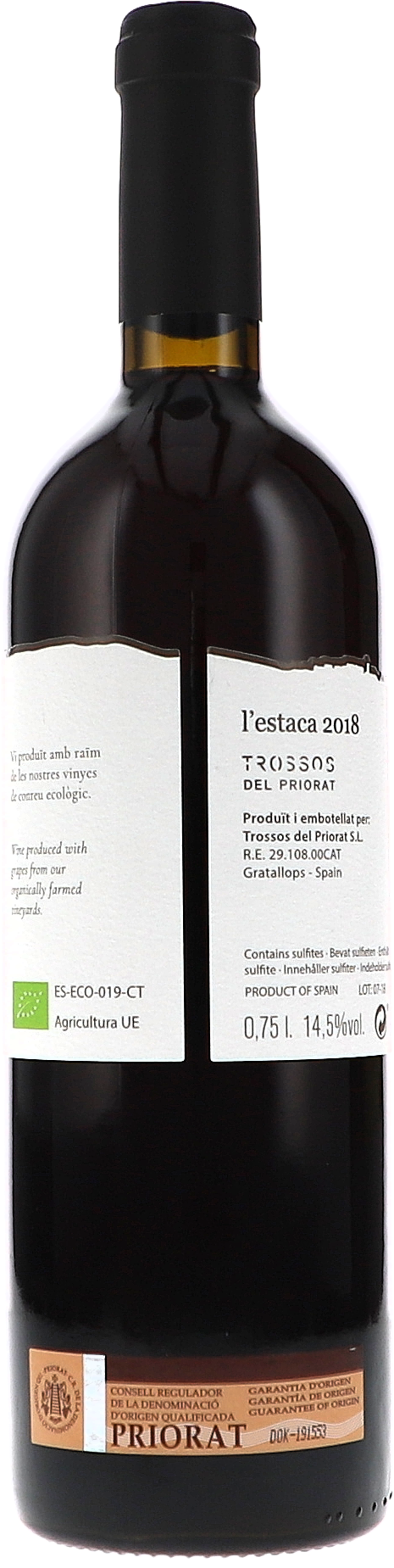 Der biologisch zertifizierte Rotwein ist rebsortenrein aus Garnacha Tinta (Grenache) gekeltert. Das Weingut Trossos del Priorat und dessen Weinberge mit den berühmten Schieferböden des Priorats befinden sich in der Gemeinde Gratallops, im etwas wärmeren Teil des Weinbaugebiets. L’Estaca ist im Stil eine typische saftig-weiche und runde Garnacha aus dem Mittelmeerraum. Der Wein reifte 12 Monate in französischen Barriques.