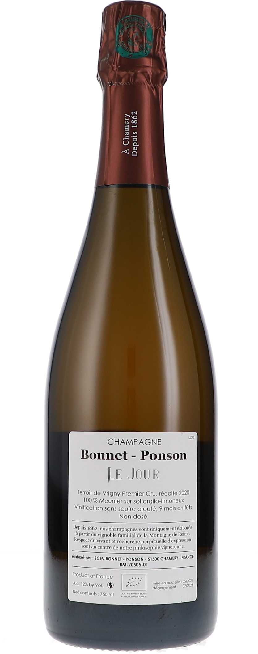 Der Le Jour ist ein Champagner aus 100 % Pinot Meunier. Die Frucht stammt aus der Premier-Cru-Einzellage Le Jour in Vrigny. Die Reben, die im Jahre 1971 gepflanzt wurden, stehen auf einem Lehm-Schluff-Boden mit einem Kalkstein-Untergrund. Der Grundwein aus der Cœur de Cuvée wurde spontan vergoren und über neun Monate in vier Jahre alten 228- und 400-Liter-Fässern ausgebaut. Es fand ein biologischer Säureabbau statt. Der Wein wurde nicht geschwefelt, sondern als Brut Nature degorgiert. Diese Flasche wurde 05/2021 gefüllt und 02/2023 degorgiert.