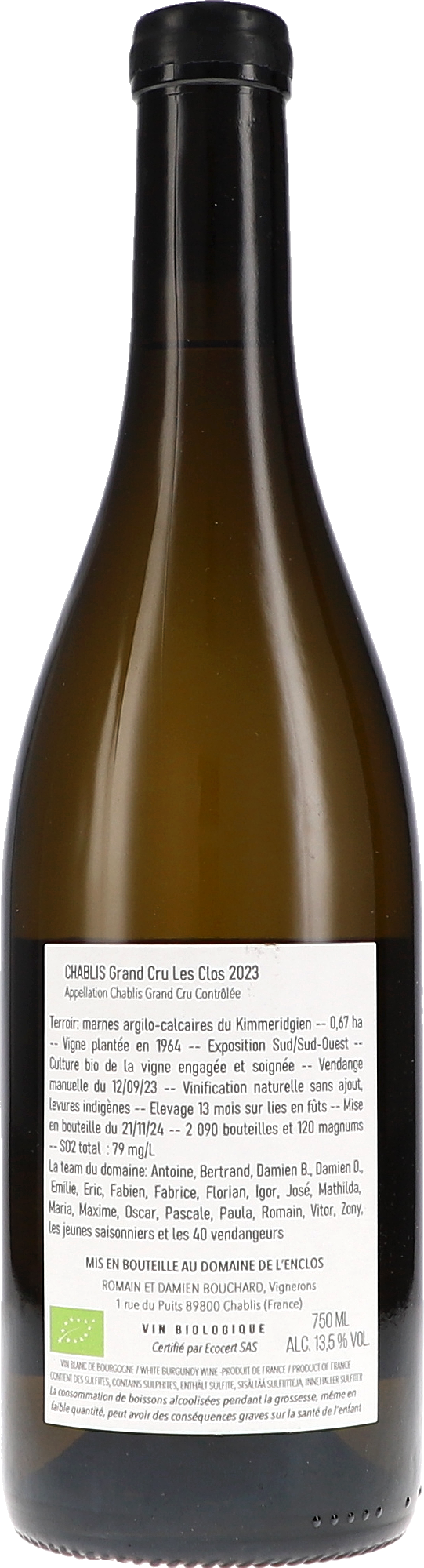 Romain und Damien Bouchard sind die Brüder, die hinter der Neugründung der Domaine de l’Enclos stehen. Sie haben schon früh in der elterlichen Domaine gearbeitet und kennen das Chablis im Innersten. Vor einigen Jahren konnte Romain die Domaine de la Grande Chaume übernehmen, die er auf biologischen Anbau umgestellt hat. Sie haben diese Domaine mit der elterlichen zusammengeführt und l’Enclos gegründet. Auch hier steht biologisch-organischer Anbau im Mittelpunkt, der seit 2017 durch biodynamische Methoden ergänzt wird. Mit viel Aufwand wird in den Weinbergen gearbeitet, zu denen einige der Filetstücke berühmter Cru-Lagen, wie Fourchaume, Blanchot oder Les Clos, gehören. Im Keller setzen die beiden auf eine Mischung aus Edelstahl und gebrauchten Holzfässern. Das gibt den Chardonnays die perfekte Balance aus Frische, Kraft und Klarheit, aber auch Struktur und elegante Opulenz. Das Ergebnis sind unglaublich gut zu trinkende Chablis.