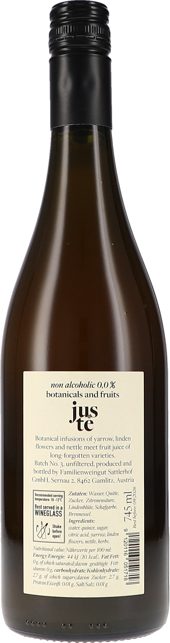 Für diesen Getränk, das speziell für das Restaurant am Sattlerhof kreiert wurde, wird eine alte Quittensorte verwendet, die besonders aromatisch ist, aber wenig Zucker in sich trägt. Dazu kommen Kräuterauszüge von Schafgarbe, Brennnessel, Linde und mehr, die in unterschiedlichen Temperaturstufen gebraut wurden. Der Zuckergehalt liegt hier lediglich bei 2,6 g/100ml.