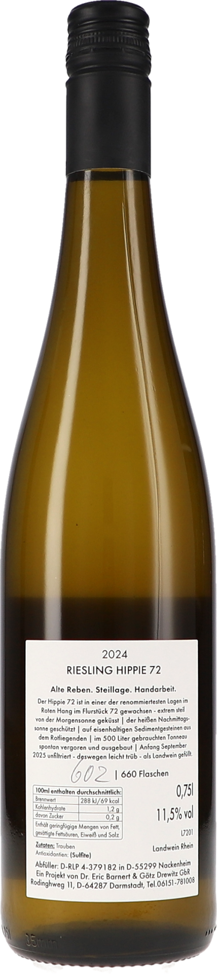 Der 2024er Riesling Hippie von Barnert & Drewitz verkörpert Ursprünglichkeit und Frische pur, Zitrone, Zitronenmelisse, grüner Apfel und Limette sind allgegenwärtig. Feine Hefenoten und ein Hauch Pfeffer deuten sich dezent an.