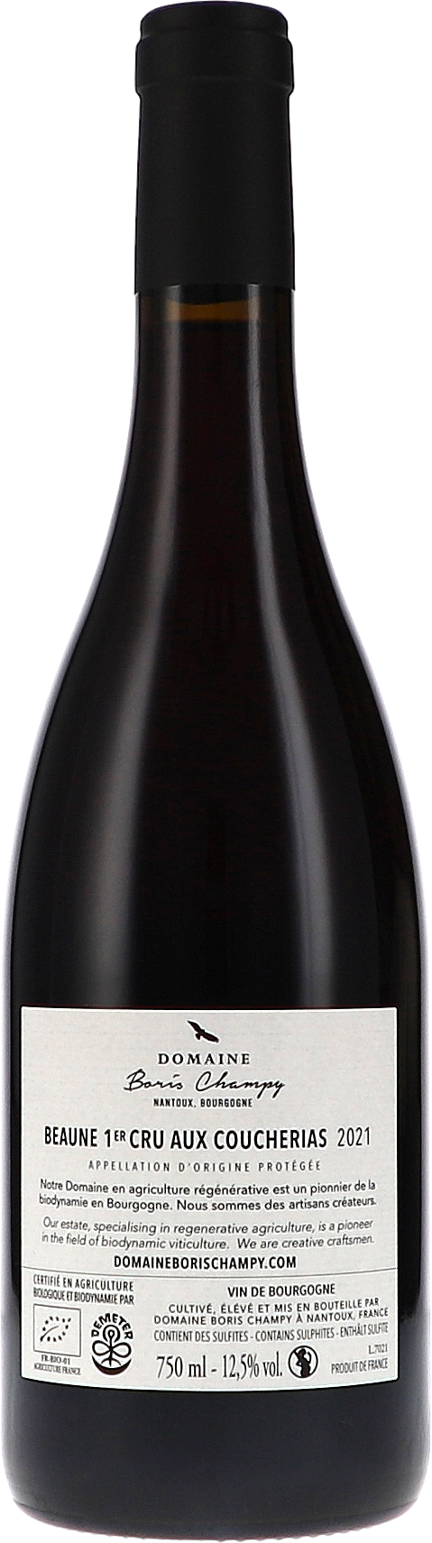 Boris Champys Beaune 1er Cru Aux Coucherias2021 duftet nach Rappen, Erde und einer Frucht von Himbeeren und Walderdbeeren, etwas Kirsche und Pflaume. Unterlegt wird das mit etwas Schotter und laktischen Noten. Darüber liegt ein Hauch von Veilchen und Laub.