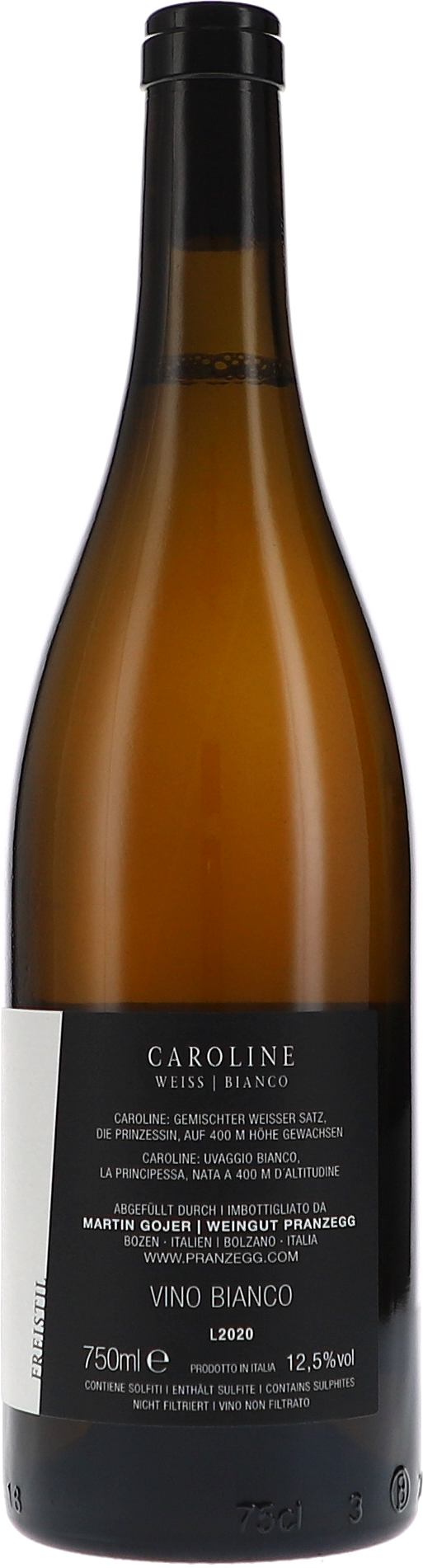 Die Anteile der verwendeten Sorten der Cuvée Caroline variieren von Jahr zu Jahr und stammen aus einem gemischten weissen Satz, der aus Sauvignon, Chardonnay sowie Viognier und Manzoni bianco besteht. Die Trauben wachsen auf gut 400 Metern Seehöhe, wurden von Hand gelesen und danach zusammen eingemaischt und lagen für sechs Tage mit einem Anteil von rund 60% Kämmen auf ihren Schalen. Nach dem Abstich kam die Caroline in die Fässer, wo sie für ein Jahr auf der Vollhefe lag, bevor sie vor der neuen Ernte für weitere elf Monate ins Beton gelegt wurde.