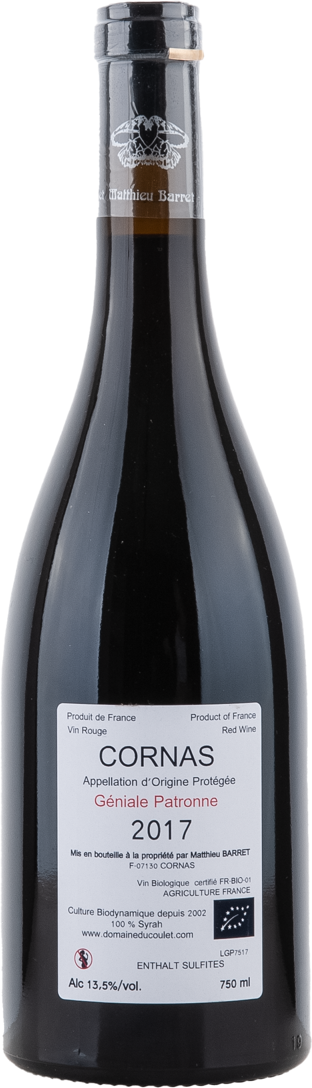 Der Cornas „La Géniale Patronne“ stammt von Granit Verwitterungböden, die von Ton- und Kalkschluff durchzgen sind. Der Wein aus 100% Syrah besteht aus einer Selektion junger und alter Rebenanlagen aus den Mittelstücken von Barrets Hängen. Mit einem durchschnittlichen Ertrag von 25hl/ha wird er im Stahl vergoren und reift anschließen in Beton-Eiern.
