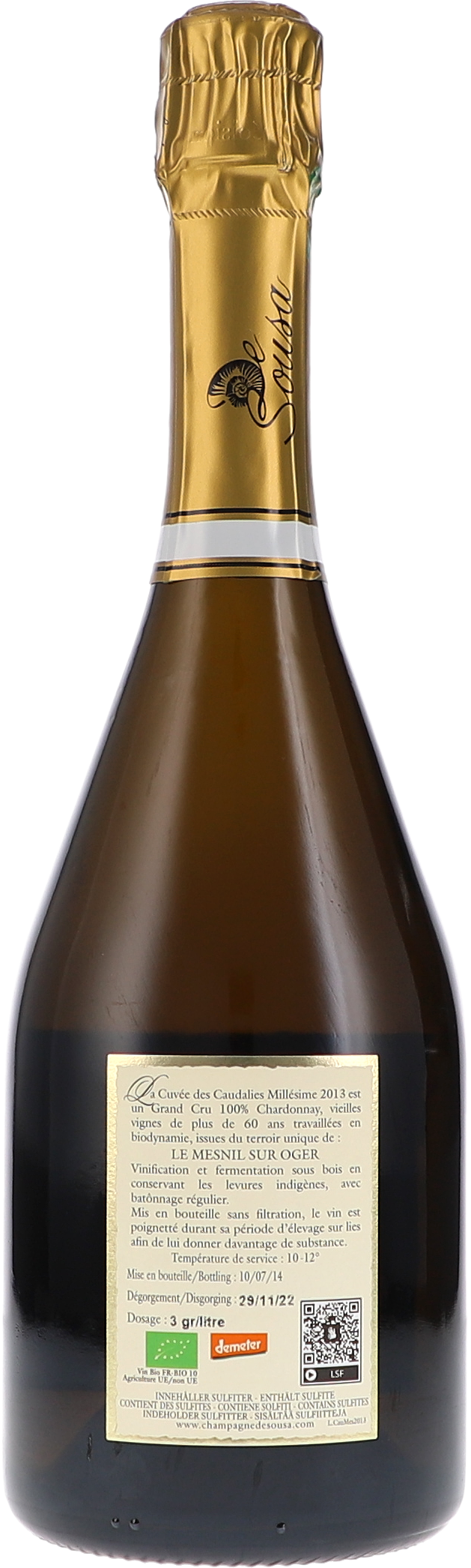 Die Cuvée des Caudalies Millésime 2013 ist ein Grand Cru aus 100 % Chardonnay von über 60 Jahre alten Reben vom einzigartigen Terroir von Le Mesnil-sur-Oger. Die Trauben wurden spontan mit wilden Hefen im Holz vergoren und regelmäßig battoniert. Der Wein wurde ohne Filtration am 10. Juli 2014 abgefüllt und am 29. November 2022 degorgiert und mit drei Gramm Versanddosage versehen.