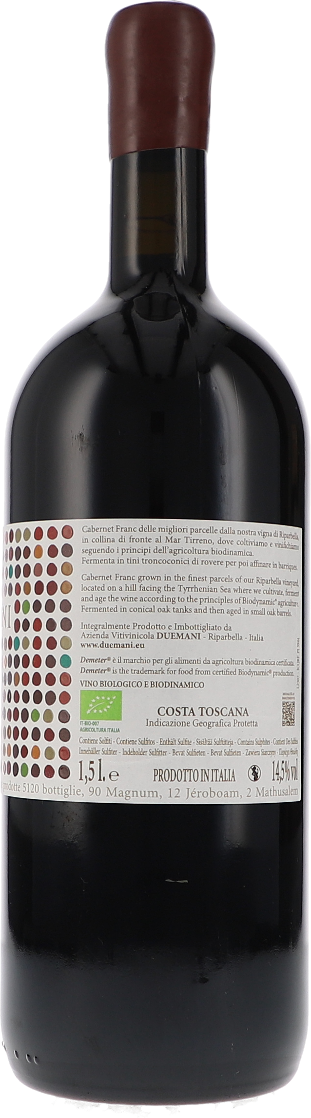 Cabernet Franc aus den besten Parzellen des Riparbella Weinberges, der zum Thyrenischen Meer ausgerichtet ist. Ausgebaut nach biodynamischen Richtlinien in konischen Holzfässern, anschließend gereift in Barriques. Gefüllt ohne Klärung und Filtration.