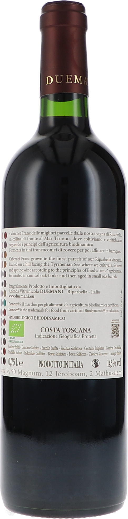 Cabernet Franc aus den besten Parzellen des Riparbella Weinberges, der zum Thyrenischen Meer ausgerichtet ist. Ausgebaut nach biodynamischen Richtlinien in konischen Holzfässern, anschließend gereift in Barriques. Gefüllt ohne Klärung und Filtration.
