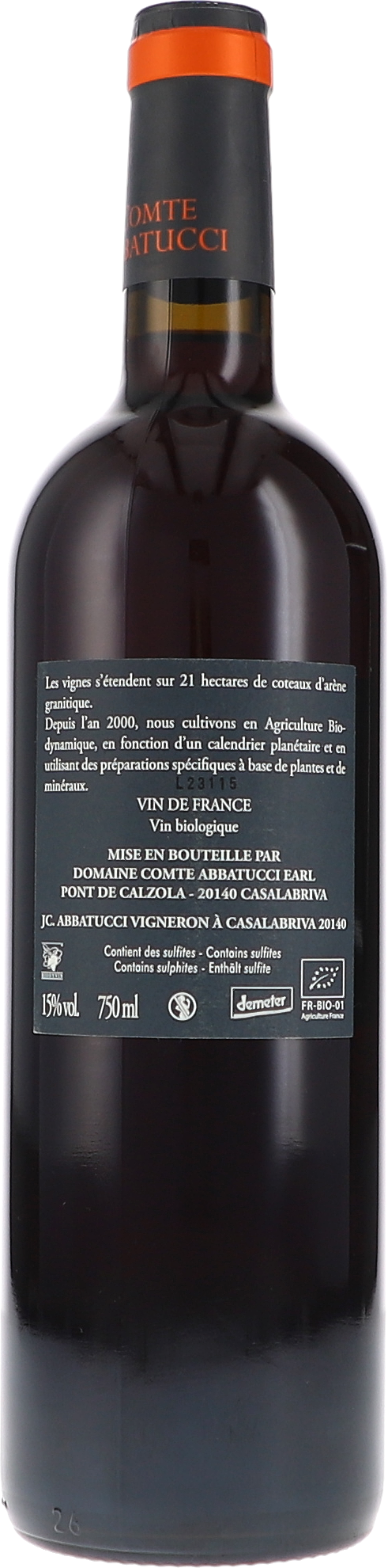 Die Abbatuccis sind eine alteingesessene korsische Familie. Ihre berühmtesten Mitglieder waren Général de la Révolution, Diplomate d’Empire und Ministre Impérial. Heute würdigen drei der beeindruckendsten Weine Korsikas die illustren Ahnen. Der Aufbruch in die Zukunft erfolgte ab 2000, als sich Jean-Charles der Biodynamie zuwandte und sich auf das Erbe der alten Rebsorten konzentrierte. Das Terroir der Domaine besteht aus Granit, der mit Sand und Schluff bedeckt und mit leichten Variationen nach Norden und Nordosten ausgerichtet ist. Diese Ausrichtung sorgt auf natürliche Weise für Frische und Spannung in den Weinen. Gelesen wird von Hand, die Trauben kommen in Kästen zum Keller, wo die Lese systematisch selektiert wird. Die Gärung vollzieht sich durch Spontanhefen, der Ausbau findet bei den Weißweinen auf den Hefen ohne Aufrühren statt und nur filtriert wenn notwendig.