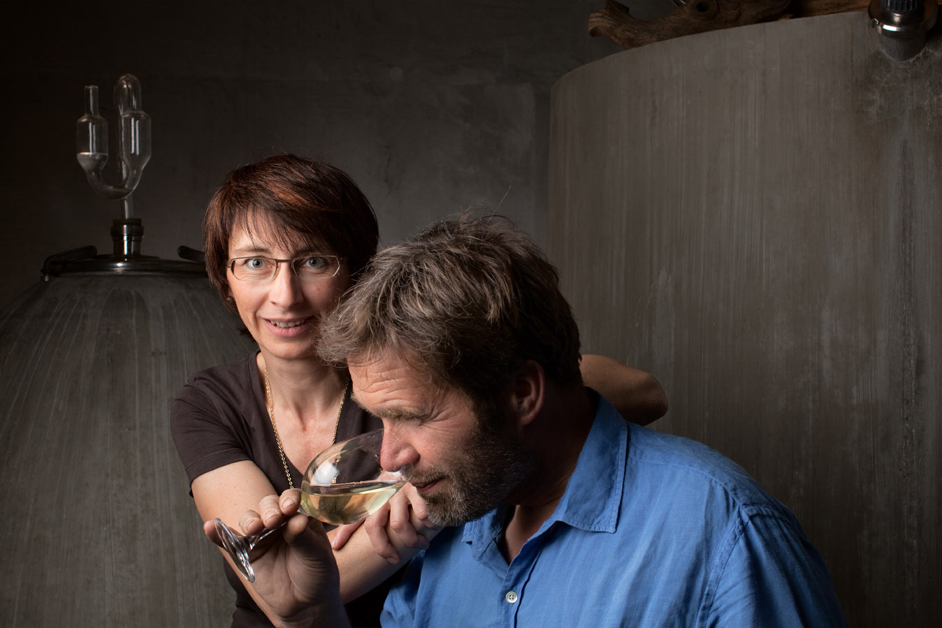 Jean-Louis Trapet in Gevrey-Chambertin und Ehefrau Andrée Trapet in Riquewihr führen quasi ein vinöses Doppelleben mit zwei vorbildlich biologisch-dynamisch geführten Weingütern, ein rotes im Burgund und ein weißes im Elsass. Beide eint eine fast schon philosophische Einstellung zum Winzersein: „Von den ersten Knospen bis zur Ernte werden die Trauben begleitet, aber niemals gezwungen.“ Andrées Credo lautet: „Der Mensch oder der Winzer kommt und geht. Was bleibt, ist der Boden! Wir gehen nur vorbei!“ Da hört man heraus, wie sehr sie mit ihrer elsässischen Heimat verbunden ist. Deswegen war sie auch nicht davon abzubringen, das Weingut ihrer Eltern im Elsass weiterzuführen. Als Andrée das Weingut von der Familie übernahm, umfasste es zwei Hektar, heute sind es 15,5. Das Weingut verfügt über Parzellen in den vier Grand-Cru-Lagen Sonnenglanz, Schonenbourg, Sporen und Schlossberg sowie zahlreiche Lagen in Kientzheim, Ammerschwihr, Riquewihr, Mittelwihr, Zellenberg, Hunawihr und Beblenheim. Neben den Grands Crus entstehen trockene Rieslinge, Gewürztraminer mit und ohne Restsüße sowie Auxerrois und ein Crémant d’Alsace.