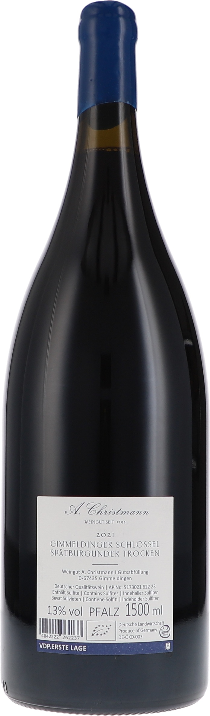 Die Lage Schlössel in Gimmeldingen knüpft nördlich an die Meerspinne an. 0,9ha besitzt Christmann in dieser VDP. Erste Lage. Seine sanfte Neigung ist nach Osten ausgerichtet und kippt nach Norden weg. Nur in schwachen Zügen ist die Kaltluft aus dem Gimmeldinger Tal hier wahrnehmbar. Im Boden findet man ein Gemisch aus Kalk-Löss sowie Buntsandsteingeröll. Im Jahre 2017 wurde dieser Weinberg auf Spätburgunder umveredelt. Seit 2019 steht er wieder im Ertrag.