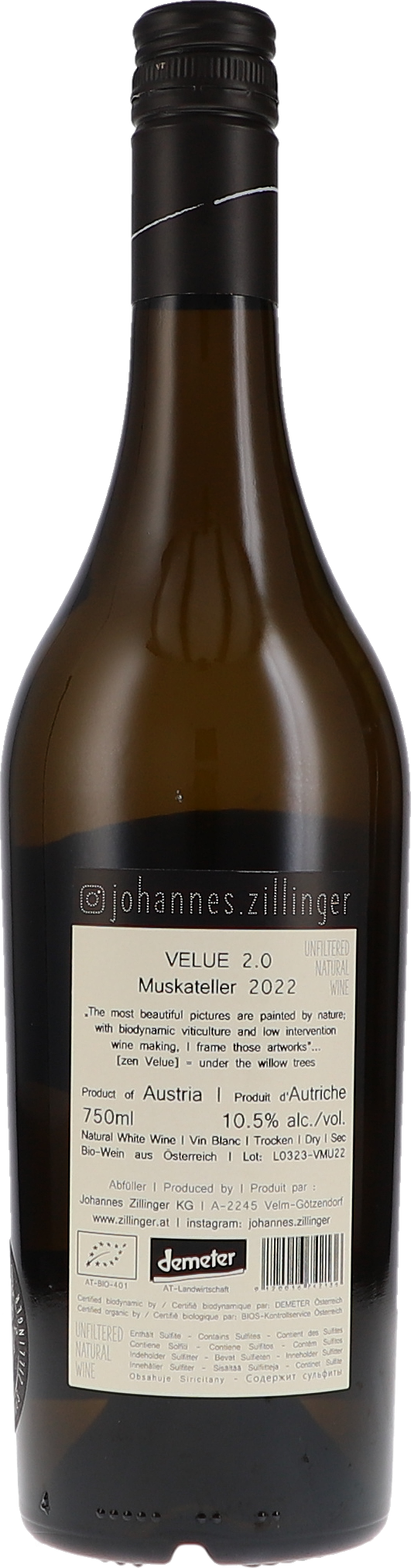 Velue ist der alte Name des Ortes Velm-Goetzendorf und auch der Weiden, welche entlang der Bäche des Ortes wachsen. Der Muscat Blanc à Petit Grains ist eine Selektion aller Muskateller-Lagen von Zillinger. Die Trauben wurden am 12. September 2022 von Hand gelesen, mit den Füssen gestampft und für sechs Stunden auf der Maische belassen. Danach wurde gepresst und spontan vergoren. Der Ausbau erfolgte in großen gebrauchten Tonneaux und im Edelstahl für sieben Monate auf der Hefe. Der Wein wurde im März 2023 mit 35 mg Gesamtschwefel, 3,1 pH und 1 Gramm Restzucker gefüllt.