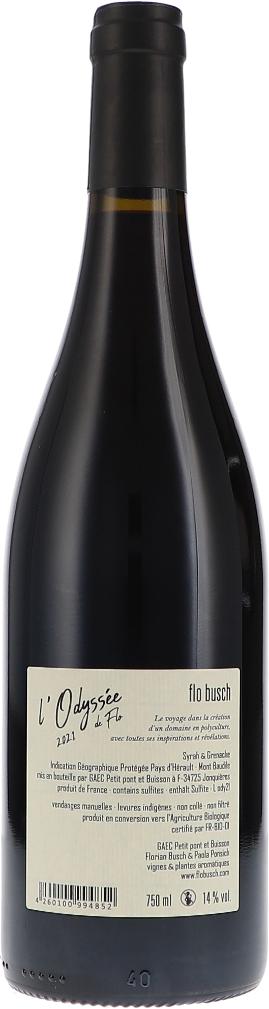 L´Odyssée de Flo basiert auf 60% Syrah und 40% Grenache Noir aus Mont Baudile. Der Syrah steht auf einem Geröll von Kalksteinen, während der Grenache auch auf ausgewaschenen Kieselsteinen und Quarz wächst.
