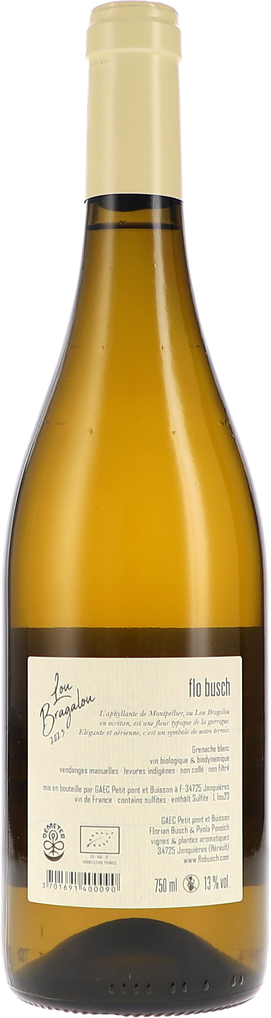 Ursprünglich war es Florian Buschs Idee, zusammen mit seinem Bruder Johannes irgend- wie die tragende Rolle im Weingut ihrer Eltern in Pünderich an der Mosel zu übernehmen. Aber Florian hat seine Liebste im Languedoc gefunden und zusammen mit ihr, mit Paola Ponsich, 2018 die Domaine Flo Busch gegrün- det. Das Weingut liegt in Jonquières im Dépar- tement Hérault. Das Terroir ist zum Großteil von Kalksteinschotter als Basis, und ein kleine- rer Teil vom Kalksteinmergel geprägt, auf dem die beiden aktuell 8 Hektar Grenache Blanc und Grenache Rouge, Vermentino, Carignan und Syrah bewirtschaften. Die Weinberge sind schon zertifiziert oder befinden sich in Umstel- lung auf biologischen Weinbau.