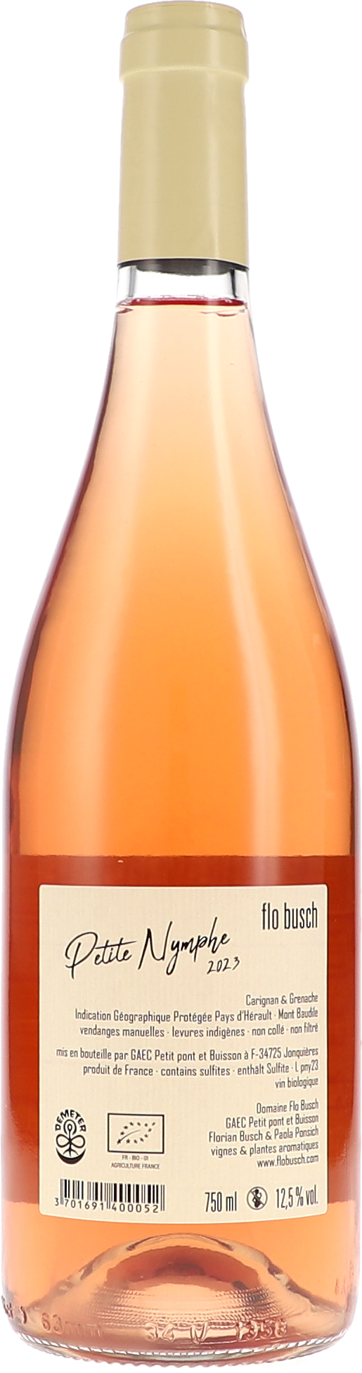 Cuisse de Nymphe ist der Name einer Rosensorte, die am liebsten frühmorgens gepflückt wird, wenn es noch kühl ist und der Tau noch auf den Blättern liegt. Zum besseren Verständnis haben Flo Busch und Paola Ponsich den Wein in Petite Nymphe umbenannt. Es ist eine Cuvée aus Carignan und Grenache Noir. Der Grenache Noir stammt aus einem Weinberg mit etwa 30 Jahre alten Reben. Der Boden besteht aus Kalksteinschotter und großen Flusskieseln mit einem hohen Quarzanteil. Der Carignan stammt aus einem Weinberg mit einer Mischung aus gelbem und blauem Kalkmergel, Sandstein, Kieseln und Fossilien. Nach der Handlese wurden die Trauben gepresst und spontan vergoren. Die Reifung erfolgte sechs Monate lang im Tank, der Wein wurde unfiltriert in Flaschen abgefüllt.