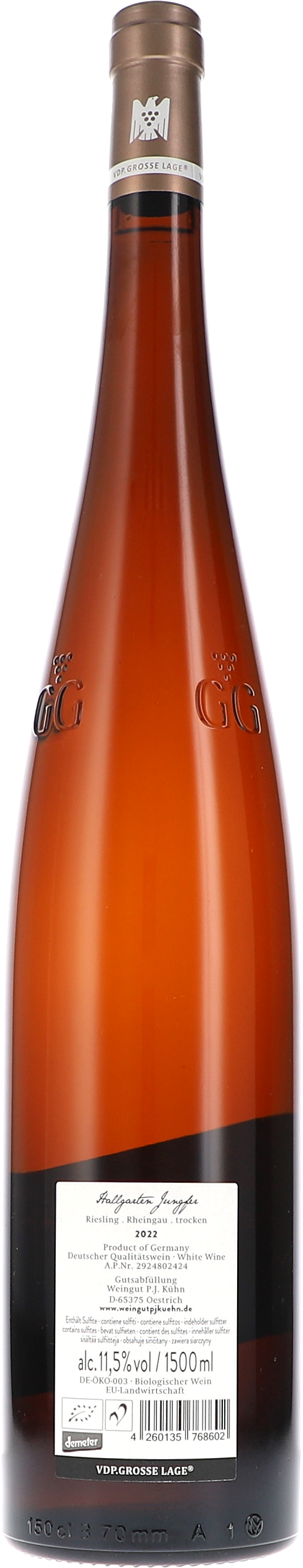 Das RieslingGroße Gewächs aus der Hallgartener Jungfer 2022 ist ein komplexes Werk, das ganz leichte, schwebende Noten mit geerdeten verbindet. Es duftet nach Blüten, Rauch und Erde, nach Mostapfel, Heu, etwas Fenchel und Anis, nach Mandeln und Pfirsichen mit ein wenig zerstoßenem Schiefer dazu.
