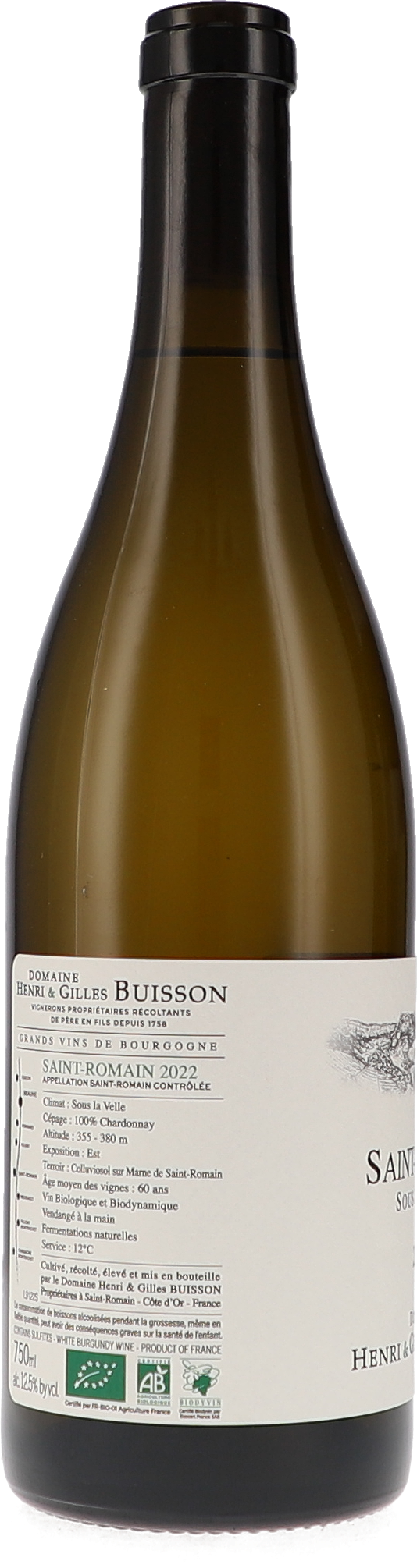Der Saint-Romain Sous la Velle 2022 stammt aus der gleichnamigen Lage nahe der Ortschaft und nördlich angrenzend an Sous le Château. Sous la Velle ist nach Südosten ausgerichtet und liegt auf 355 bis 380 Metern. Im Weinberg mit sogenanntem Colluviosol auf Marne-de-Saint-Romain-Kalkstein stehen 60 Jahre alte Chardonnay-Reben. Handlese, Ganztraubenpressung und spontane Vergärung im Holz. Die malolaktische Gärung erfolgt spontan in den Fässern. Der Ausbau läuft über zehn bis zwölf Monate in einer Mischung aus 228-, 350- und 500-Liter-Barriques und Tonneaux, von denen höchstens 10 % jährlich ersetzt werden. Der Wein wird täglich probiert, und die Fässer werden abgezogen, sofern es Frédéric Buisson für sinnvoll hält. Es wird mit Bentonit geschönt und nur sehr grob filtriert. Geschwefelt wird erst bei der Füllung mit höchstens 40 bis 50 mg/l Gesamt-Sulfit. Das Weingut ist mittlerweile Biodyvin-zertifiziert.