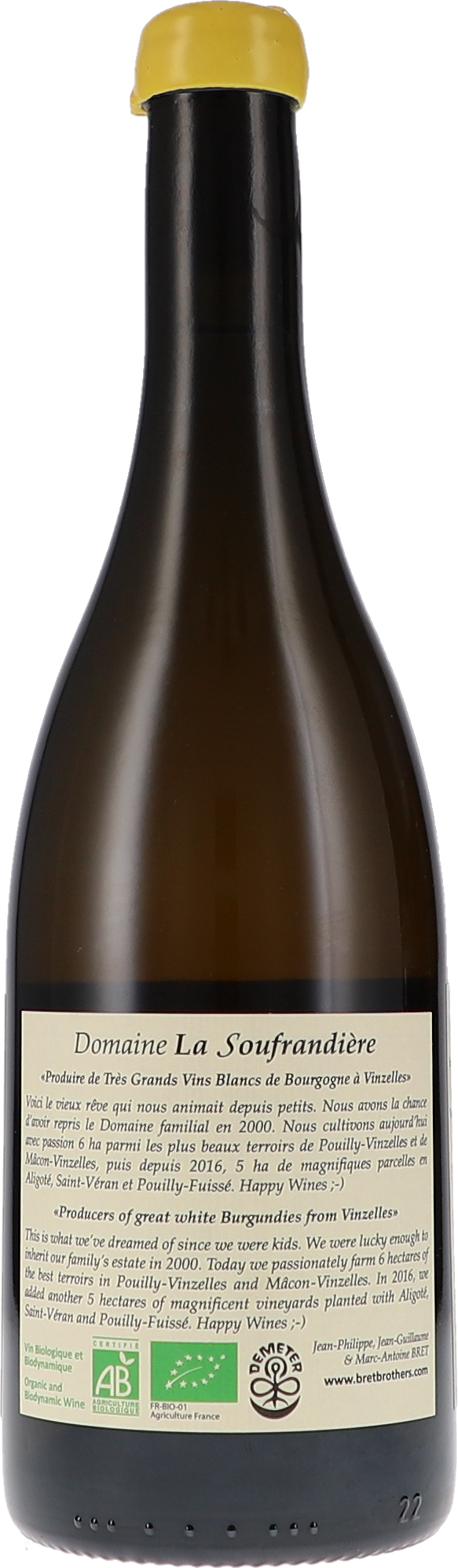 Die Gebrüder Bret haben dieses wunderschöne Grundstück von etwa 1,5 Hektar im Jahr 2016 erworben. Es liegt an den Hängen eines Tals unterhalb des Roche de Vergisson in nördlicher Ausrichtung. Die Böden aus Kalkmergel und hellem Lehm sind ideal für den Chardonnay. Trotz dieses kühleren Terroirs erreichen die Trauben eine schöne Reife. Die Lese fand zwischen dem 31. August und 1. September 2022 statt. Der Chardonnay wurde als ganze Traube gepresst und spontan vergoren. Darauf reifte er über ein knappes Jahr zu 80 % im Tank und zu 20 % in bis zu zehn Jahren alten pièces. Es erfolgte eine malolaktische Gärung. Der pH-Wert liegt bei 3,28 und der Gesamt-Schwefel liegt bei 49 mg/l.