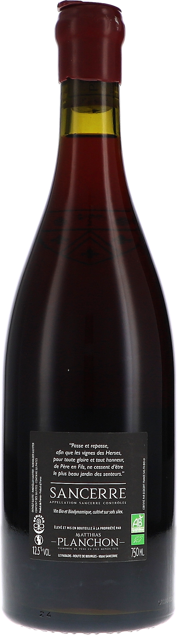 Weinberge von 0,98 Hektar, die in der Ortschaft "Les Herses" auf einem "Silex"-Boden angebaut werden. Das steinige, nach Südosten ausgerichtete Terroir verleiht dem Wein eine gewisse Struktur. Die Pinot Noir Reben sind durchschnittlich 45 Jahre alt, die Pflanzdichte beträgt 7.700 Rebstöcken pro Hektar, bei einem Ertrag von 40hl. Nach der Handlese durchlaufen 30% ganze Trauben und 70% abgebeerte Trauben über 2-3 Tage eine Kaltmazeration vor der Gärung. Die anschließende Maischegärung erfolgt über drei Wochen. Nach kleinen Remontagen wird der Trester mit niedrigem Druck gepresst, und Vorlauf und Presssaft werden zusammengefügt. Die malolaktische Gärung erfolgt in Keramiktanks und zu 50% in 228l Holzfässern auf der Feinhefe. Nach dem Abzug aus den Gebinden erfolgt eine weitere Reifung im Edelstahltank, um den Wein zu verfeinern und gleichzeitig die Frische zu erhalten. Die Abfüllung auf die Flasche erfolgt nach dem Mondzyklus.