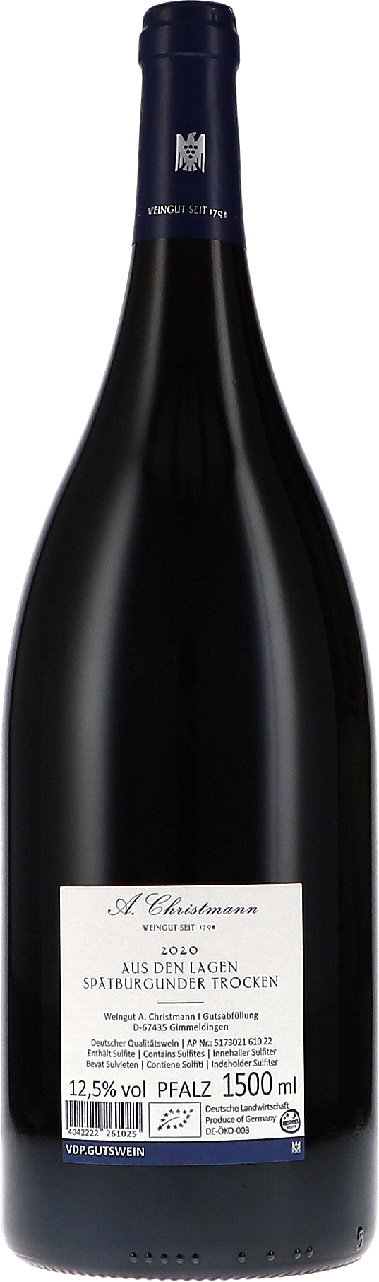 Partien aus Gimmeldinger (Kapellenberg) und Mußbacher (Eselshaut) VDP.Ersten Lagen sowie abgestufte Fässer aus den Crus in Gimmeldingen und Königsbach vereinen ihre einzigartige Struktur und Finesse miteinander. Vergoren mit 20-30 % Ganztrauben, 18 Monate ausgebaut mit 20 % neuem Holz.