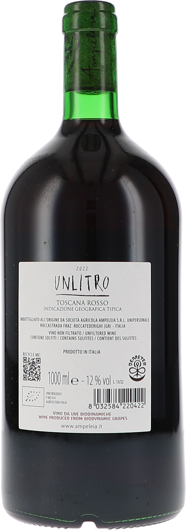 Die Cuvée aus Alicante-, Carignano-, Mourvèdre-, Sangiovese- und Alicante Bouschet stammt von den jüngsten Weinbergen in Meeresnähe. Unkompliziert im besten Sinne ist er der offenherzig authentische Schluck Maremma für jeden Tag. Gelesen wurde Ende August/Anfang September, es folgte eine dreitägige Maischegärung auf den Schalen, bevor er spontan mit eigenen Hefen vergor und anschließend für fünf Monate im Betontank reifte. Der Unlitro wurde erstmals 2011 produziert und umfasst eine Produktionsmenge von 160.000 Flaschen.