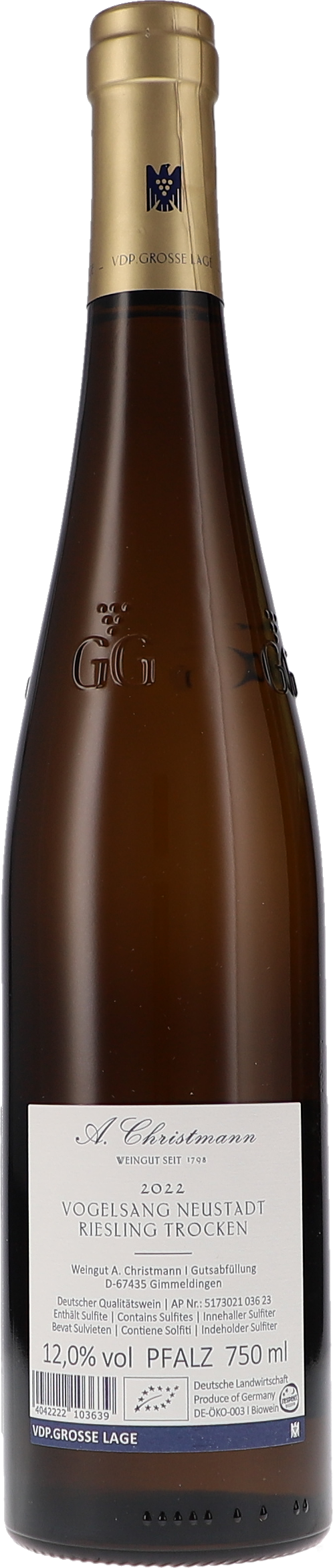 Im 19. und frühen 20. Jahrhundert an den bayerischen Königshof geliefert und in der Dichtung besungen, ist der Neustadter Vogelsang als Lage, aufgrund der Spekulation auf Bauland, in Vergessenheit geraten. Die großartige Natur und die deshalb erfolgte Unterschutzstellung verhinderten die Baupläne. So kam der Weinberg 2017 in die Hände von Christmanns. Eines der spannendsten Projekte seit vielen Jahren in der Pfalz und weit darüber hinaus. Der Boden besteht aus mehr als 200 Millionen Jahre altem Muschelkalk, der beim Einbruch des Oberrheingrabens an die Oberfläche gelangt ist und an der Mittelhaardt in dieser Form einzigartig ist. Der Weinberg fällt mit einer Neigung von bis zu 50% recht steil nach Süden ab. Aufgrund seiner Lage im Ausgang des Neustadter Tals, in bis zu 260 m Höhe, ergeben sich große Temperaturunterschiede zwischen Tag und Nacht, die für viel Spannung im Wein sorgen.