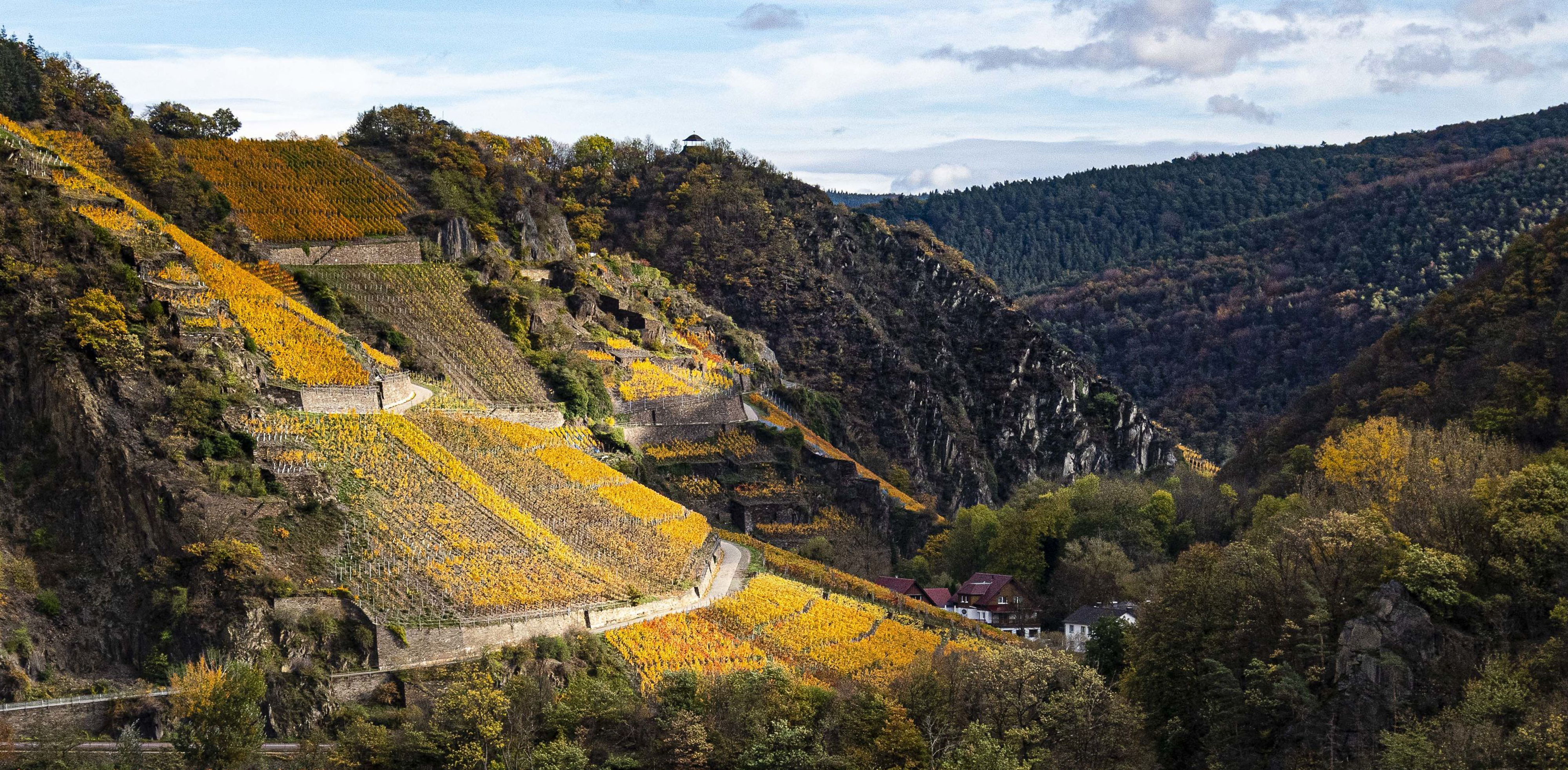 Benny und Julia bringen aus beiden Familien hervorragende Lagen mit und somit kann das Weingut die gleiche Klaviatur spielen, wie die ganz großen Weinguter der Ahr. Der Lagenreigen startet an der unteren Ahr, wo das Tal sich weit zum Rhein öffnet. Hier ist in den Eiszeiten Löss angeweht worden und kleidet die Hänge weich ein. Es ist wärmer als an der oberen Ahr, die Böden fruchtbarer und die Hänge nicht ganz so steil.