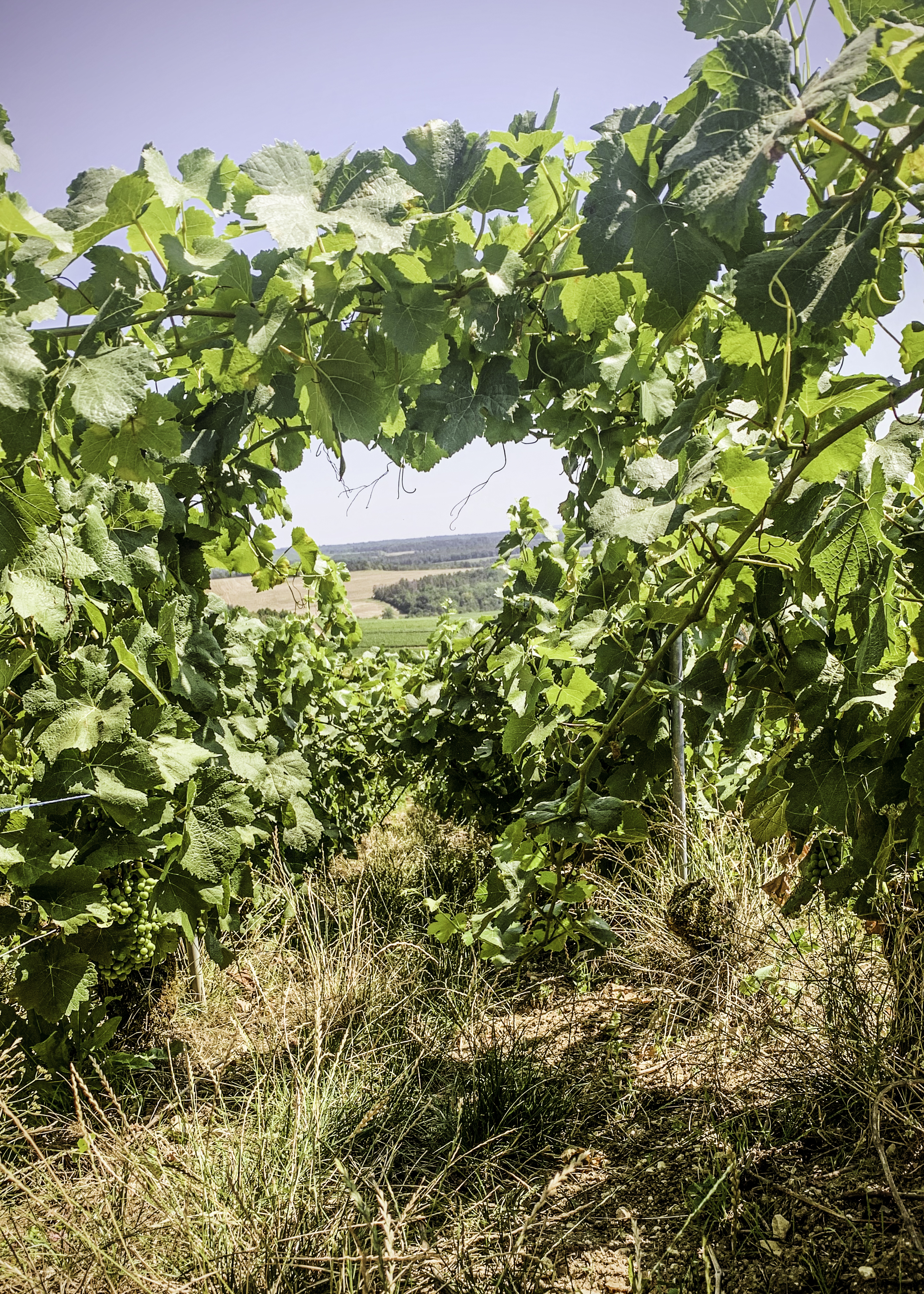 Die bildschönen Weinberge werden mit hohem Aufwand gepflegt. Dazu hat sich Delphine das Wissen um den sogenannten sanften Rebschnitt nach der Simonit & Sirch-Methode angeeignet und das gesamte im Weinberg arbeitende Team darin geschult. Die Pinot-Stöcke werden im Taille-Guyot-Schnitt erzogen, die Chardonnay-Stöcke im Taille-Chablis-Schnitt (der jedoch nicht im Chablis, sondern eigentlich nur in der Champagne angewandt wird), bei dem die Trauben deutlich freier hängen und dadurch weit weniger anfällig für Pilzkrankheiten sind. Bei Delphine macht der Rebschnitt etwa ein Drittel der im Weinberg zu leistenden Arbeit aus.